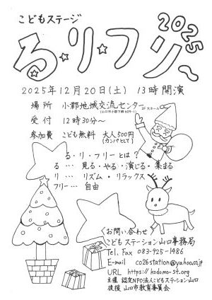 日 時2025年12月20日(土)13時開演(12時30分~受付) 会 場小郡地域交流センター料 金おとな500円(カンパとして) こども無料 一年に一度、地域の子どもたちが集まって、自由な発想で作った劇やダンス、歌などのパフォーマンスを一緒に舞台で表現しています。 舞台発表までの練習は、年齢のちがう仲間が集まってわいわいガヤガヤ。 学校では味わえない楽しさです。 る・リ・フリーとは、こどもステーション山口が作った造語 ↓ 「る」・・見る やる 演じる 「リ」・・リズム リラックス 「フリー」 ・・自由に で「る・リ・フリー」♪ みんな見にきてね。