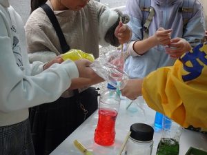 自分たちでまぜ合わせて、スライムを作っていきます。青色がいちばん人気。