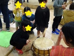 ロビーの楽器あそびコーナーでは、ウッドブロックや