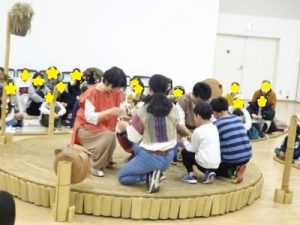 公演で使われていた楽器や動物たちを、触れたり奏でたり。